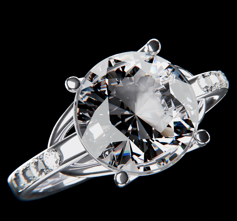 Cette création 3D explore l'équilibre entre la complexité géométrique et l'épure de la haute joaillerie. À travers cette bague solitaire au design "split shank", l'intention est de sublimer la réfraction de la lumière au cœur d'un diamant monumental, soutenu par un pavage délicat. Ce projet est une recherche sur la perfection des matériaux numériques, visant à transformer un volume virtuel en une pièce d'orfèvrerie intemporelle, où chaque facette capte l'éclat avec une précision chirurgicale.