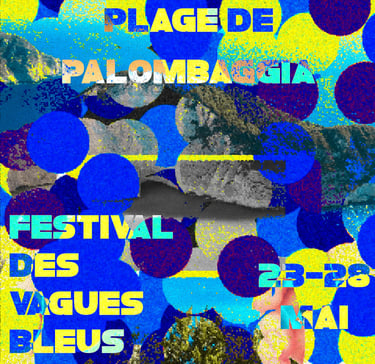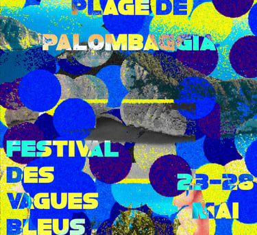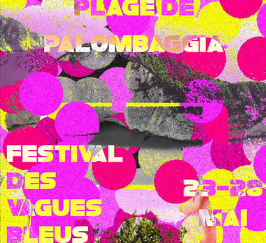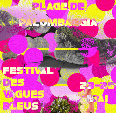les deux dernières images présentent une déclinaison colorée d'affiches conçue pour un festival d'été. Le premier visuel, aux nuances bleutées, évoque la sérénité des vagues, tandis que le second capture les lueurs du soleil couchant sur la mer