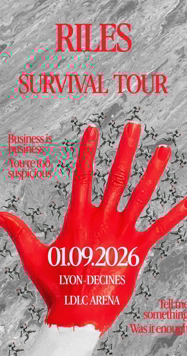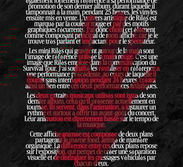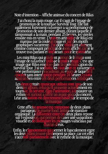 Note d'intention - Affiche animée du concert de Rilès J'ai choisi la main rouge, car il s'agit de l'image de promotion de la tournée survival Tour. Elle tait également tortement rétérence à sa pertormance de promotion de son dernier album, durant laquelle il tamponnait à la main, pendant 25 heures, les vinyles ensuite mis en vente. L'univers artistique de Rilès est marqué par la couleur rouge et par des motifs graphiques récurrents. 'ai donc choisi cet élément comme composant principal de mon attiche, car je le